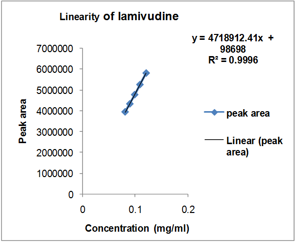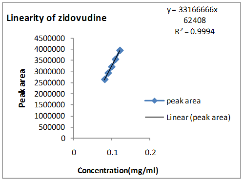 Inject each level into the chromatographic system and measure the peak area. The linearity Results were shown in the fig. No.8 and 9 shows the line of best fit for concentration versus peak area of Lamivudine and Zidovudine.