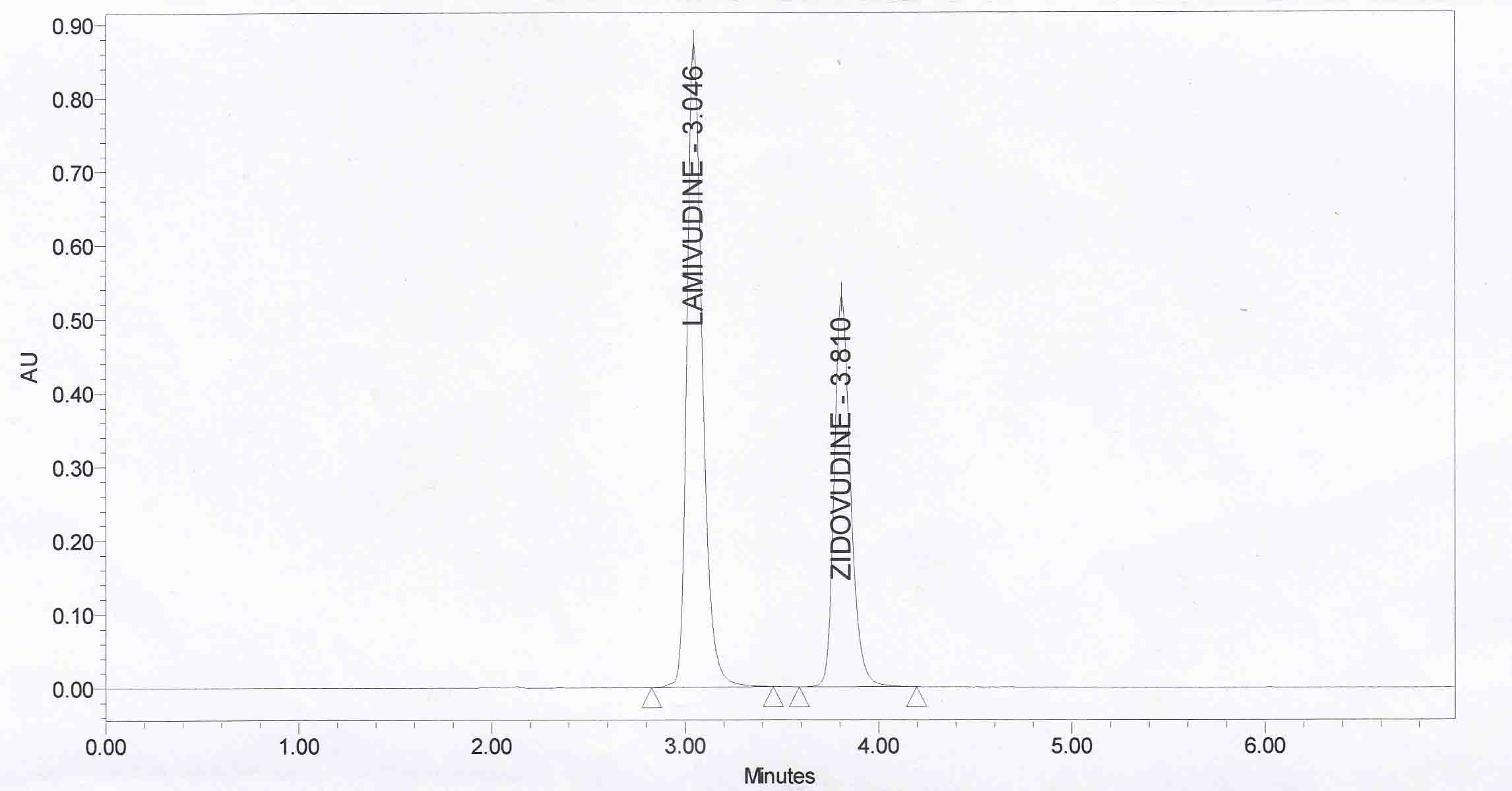 Standard solutions were prepared by using Lamivudine and Zidovudine working standards as per test method and were injected five times into the HPLC system. The system suitability parameters were evaluated from standard chromatograms by calculating the % RSD from five replicate injections for Lamivudine and Zidovudine retention times and peak areas. Chromatogram for injection 4 and 5 were shown in fig. no. 4 and 5.