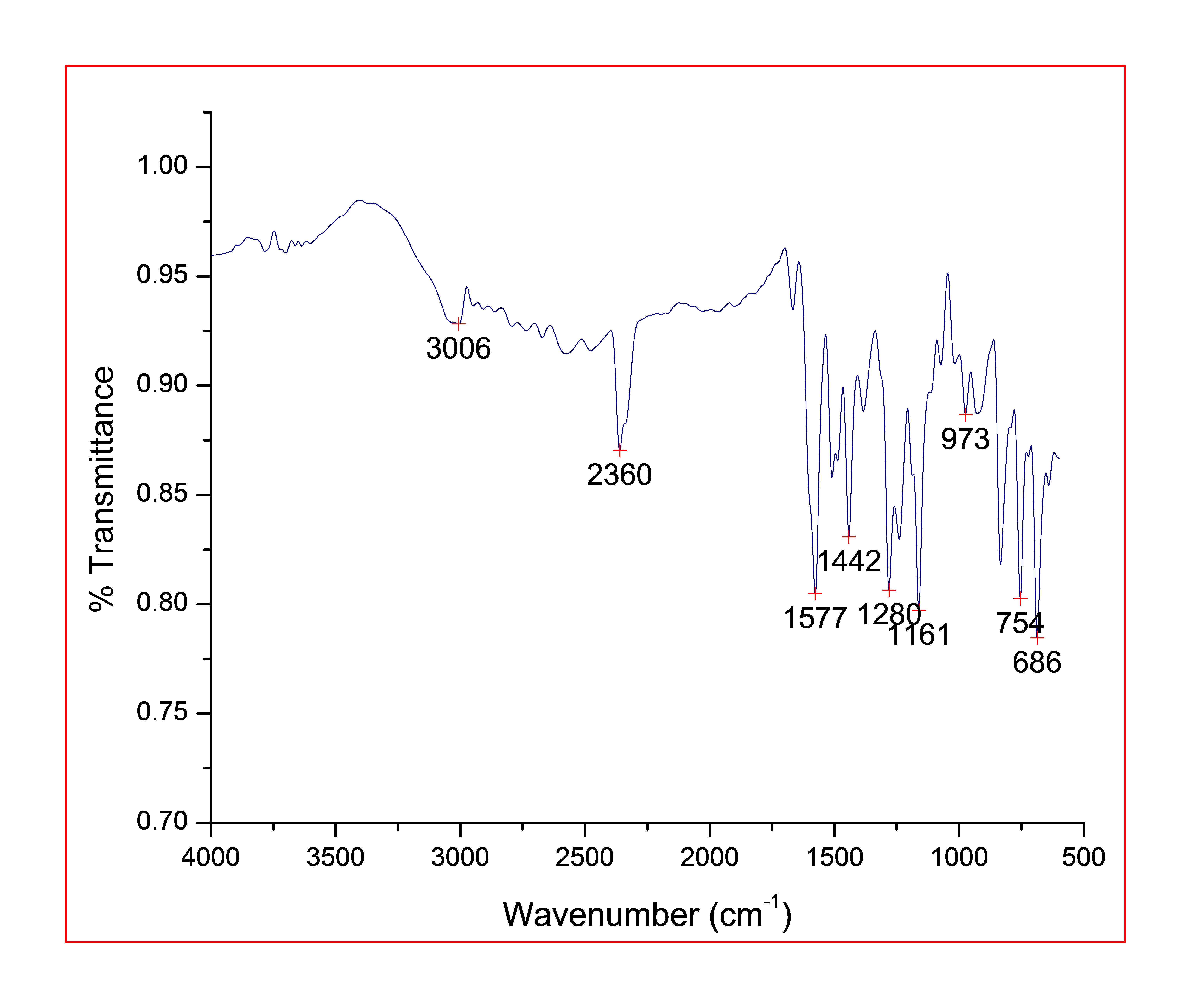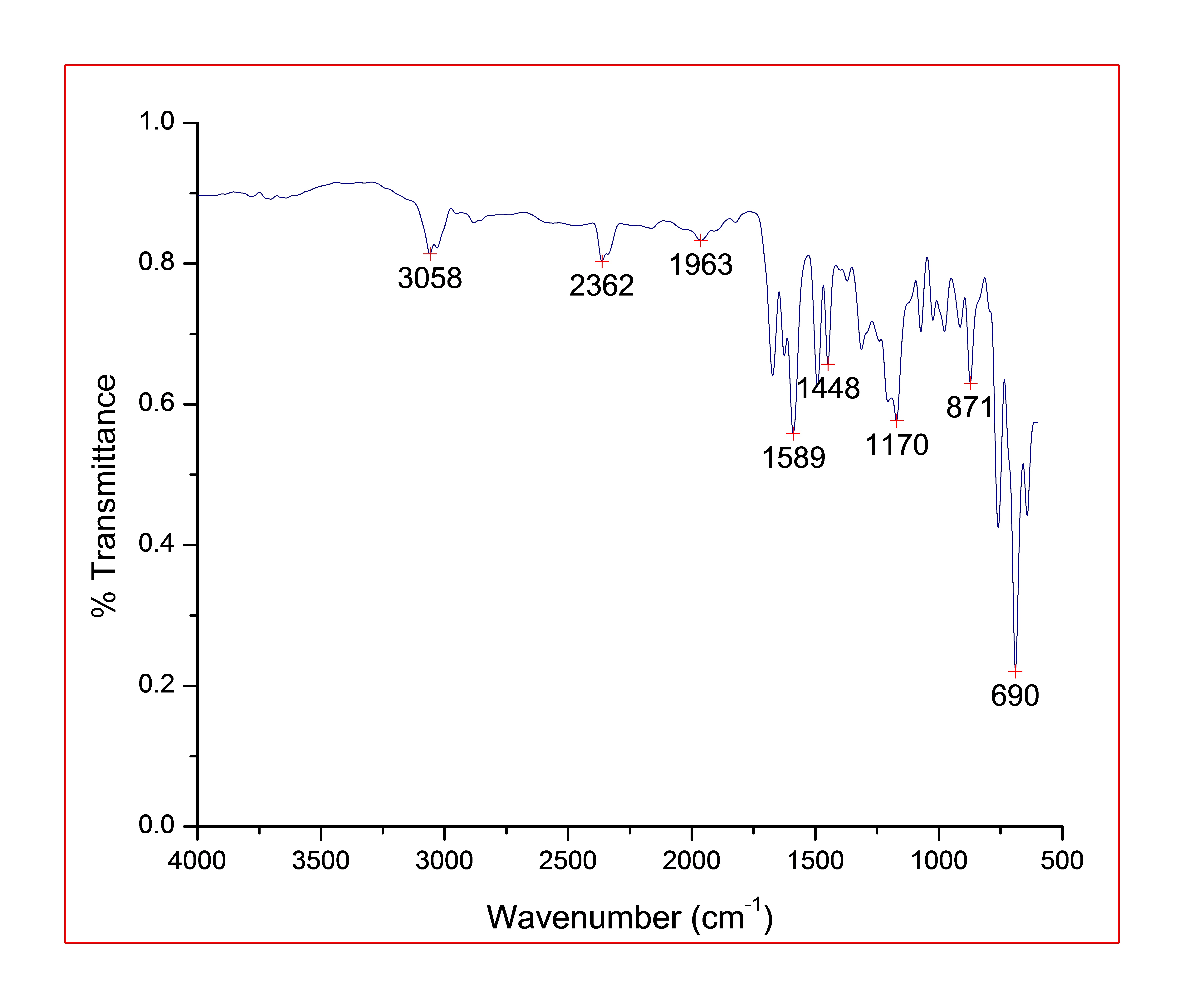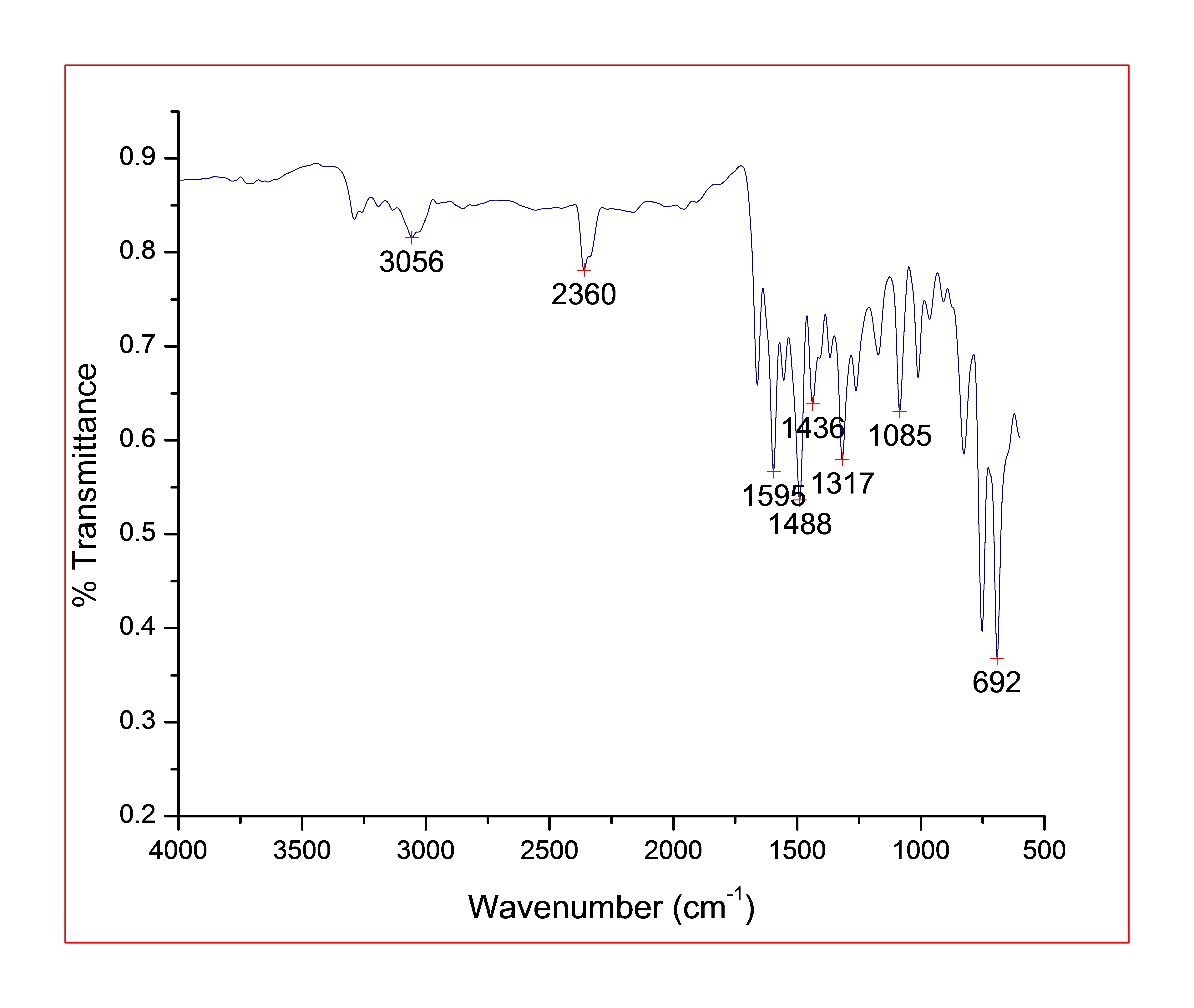 Fig. 5: FTIR spectrum of 2-(4-chlorophenyl) 1, 4, 5-triphenyl-1H-imidazole