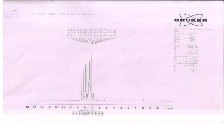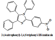 Entry 3: 2-(4-Nitrophenyl)-1,4,5-triphenyl-1H-imidazole (C27H19NO2N2): m. p. 185-1900c; FT-IR (KBr): υmax (in Cm−1) 3056 (C-H aromatic), 1591 (C=C aromatic), 1515 (C=N) 1338 (C–NO2) 1H NMR (400 MHz, CDCl3): δ (ppm) 6.6-7.8 (m, 17H, H-Ar),8.2(d,2H, H-Ar) (fig. 7-8)