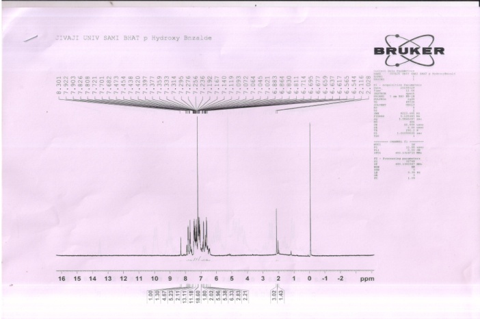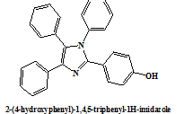 Entry 4: 2-(4-Hydroxyphenyl)-1, 4, 5-triphenyl-1H-imidazole (C27H19OHN2): m. p. 278-2800c; FT-IR (KBr): υmax (in Cm−1) 3006 (C-H aromatic), 1577 (C=C aromatic), 1442 (C=N)1085 (C–OH) 1H NMR (400 MHz, CDCl3): δ (ppm) 6.5-7.8 (m, 17H, H-Ar),7.9(d,2H, H-Ar) (fig. 9-10)