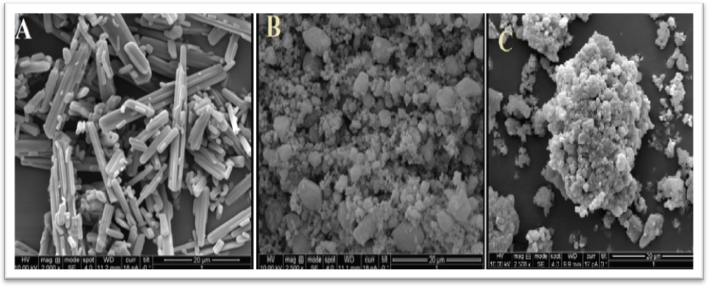Fig. 2: SEM images of A) ramipril B) sylysia and C) S-SEDDS