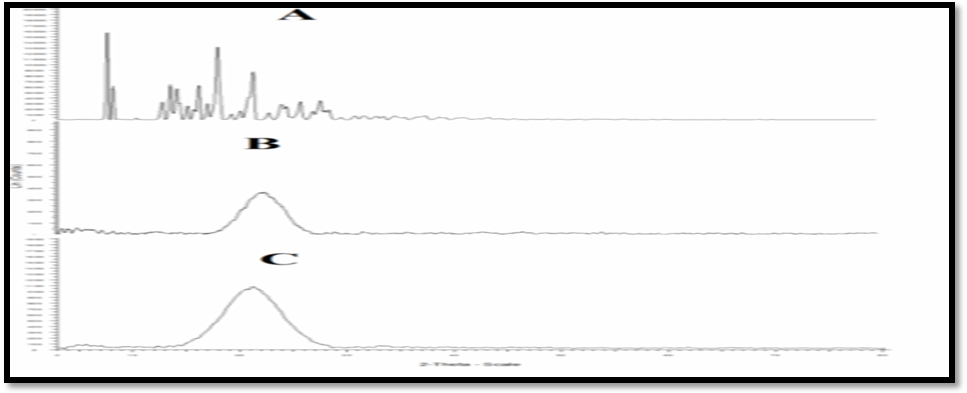 Fig. 4: Powder X-ray diffraction patterns of A) ramipril B) sylysia and C) S-SEDDS