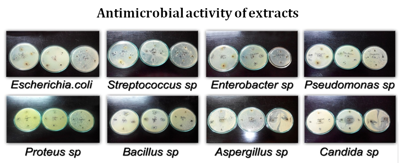 Antimicrobial activity of ethanolic, petroleum ether was tested. The organisms used for testing were Escherichia coli, Staphylococcus sp, Streptococcus sp, Pseudomonas sp, Proteus sp, Bacillus sp, Aspergillus sp and Candida sp. Overnight cultures were prepared with nutrient broth.