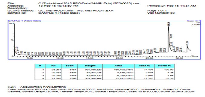 The fig. 9 and fig. 10 shows the GCMS result of Ethanol crude extract and Petroleum Ether crude extract.