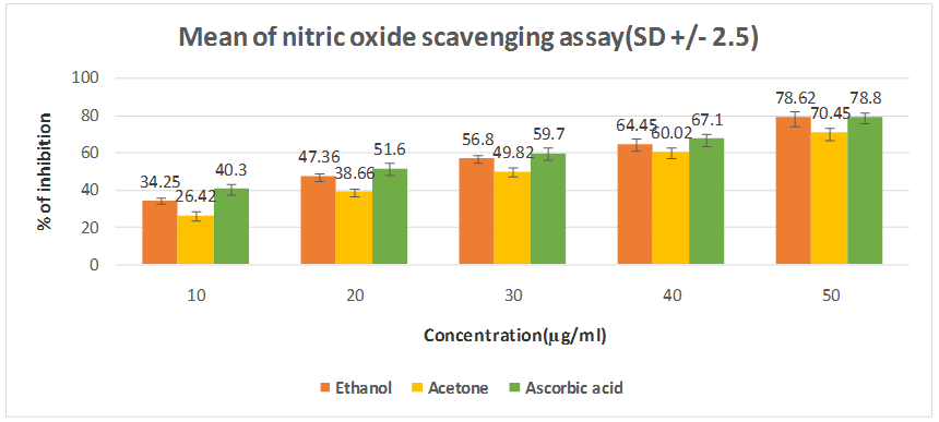 Nitric oxide scavenging activity was measured spectro-photometrically [13]. The ethanol and acetone extracts were added to different test-tubes in varying concentrations (10-40 μg/ml). Sodium nitroprusside (5 mM) in phosphate buffer was added to each test tube to make volumes up to 1.5 ml. Solutions were incubated at 25 °C for 30 min. Thereafter, 1.5 ml of Griess reagent (1% Sulphanilamide, 0.1% Naphthyl ethylenediamine dichloride, and 3% Phosphoric acid) was added to each test tube. The absorbance was measured immediately at 546 nm and the percentage of scavenging activity was measured with reference to ascorbic acid.