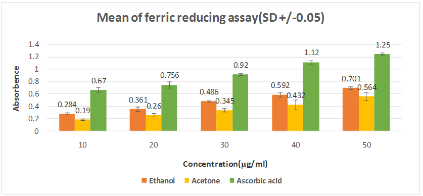 Fig. 3: Ferric reducing assay of ethanol and acetone extracts of C. amada leaf, compared to ascorbic acid