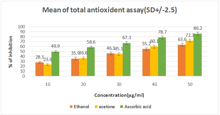 The total antioxidant capacity assay was determined as described by Prieto et al. [11]. Different concentrations of the ethanol and acetone extracts (10-50μg/ml) were taken and added 1.0 ml of the reagent solution (0.6 M Sulphuric acid, 28 mM Sodium phosphate, and 4 mM Ammonium molybdate). The tubes we recapped and incubated in a thermal block at 95 °C for 90 min. After cooling to room temperature, the absorbance of the aqueous solution of each was measured at 695 nm against a blank. Ascorbic acid was used as standard, and the total antioxidant capacity is expressed as equivalents of ascorbic acid.