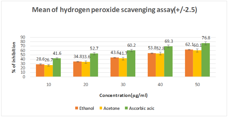 The composition of hydrogen peroxide into water may occur according to the antioxidant compounds as the antioxidant components present in the extract are good electron donors, they may accelerate the conversion of H2O2 to H2O. The H2O2 inhibition activities of ethanol and acetone extracts are given in(fig. 4). The ethanol extract showed the highest H2O2 inhibition values (28.6±1.67-62.1±2.41%) while Acetone extract had the less than H2O2 inhibition values at (26.7±1.7-.60.1±3.4%). IC50 Value of ethanol and acetone extracts was respectively 35 and 38µg/ml.