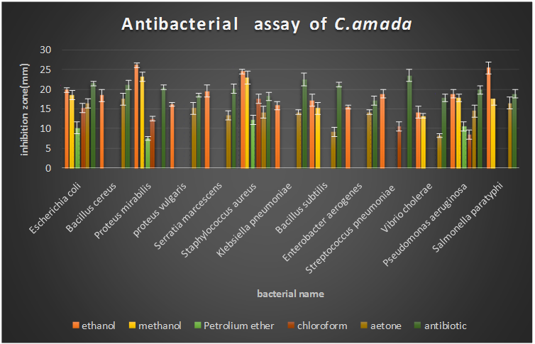 Table 2: Antibacterial activity (inhibition zone) of the leaf extracts of C. amada