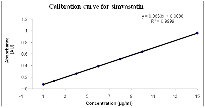 The absorbance of Simvastatin was measured using the standard concentrations from 0.25-20 µg/ml. The results showed a very good linearity of the curve at the concentration range of 1-15 µg/ml. The results are summarized in table 2. The calibration curve with line equation and R2value for Simvastatin is provided in the fig. 1.