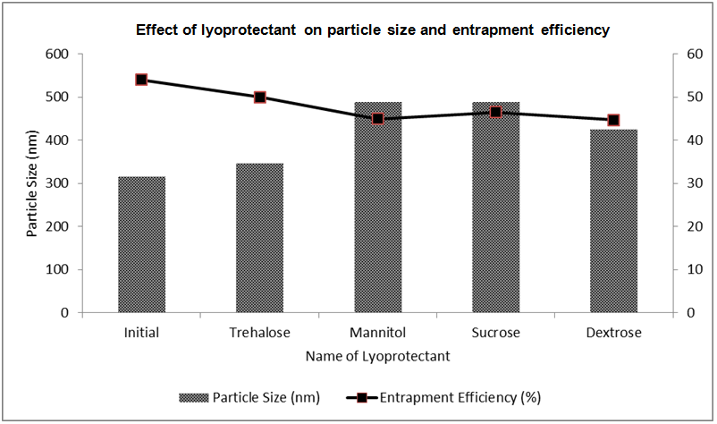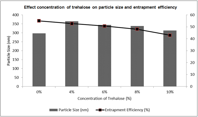 From this study, it was observed that the 10 %w/v of Trehalose will give NPs with the lowest size without much impact on the entrapment of the drug. The particle size, PDI and entrapment of the final formulation observed were 310.00±4.34 nm, 0.169±7.828 and 27.476±0.861% respectively.