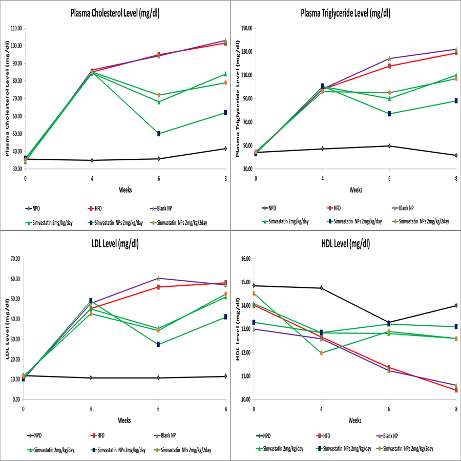 The rats were divided into six groups of n = 6. One group received NPD and all other groups received HFD. Groups receiving HFD were again divided into no treatment, and treatment groups. The animals of the treatment group were treated from 4 w-6 w with Simvastatin loaded NPs, Zocor tablets (reference product for Simvastatin) and blank nanoparticles. The dose of Zocor tablets (reference product for Simvastatin) was kept as 2 mg/kg/day. The dose of the drug loaded NPs was same as the reference product in one group (2 mg/kg/day) while half dose (2 mg/kg/2day) to the reference product was administered in another group. Blood sampling was performed initially and after four, six and eight weeks. The efficacy and safety profile of Simvastatin in individual animals were evaluated using biochemical parameters.