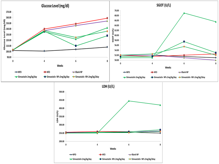 The level of the glucose was also evaluated during the treatment. The results indicate that Simvastatin causes a reduction in the glucose level. The literature data suggest that Statins are causing sensitization of insulin receptor which causes a reduction in the glucose level. The results show that the NPs were causing more reduction in plasma glucose level when administered at the same dose as the reference product. This confirms better control on glucose level in patients suffering from Hyperlipidemia. However, reducing the dose of NPs to the half will give the comparable glucose reduction as the reference product.