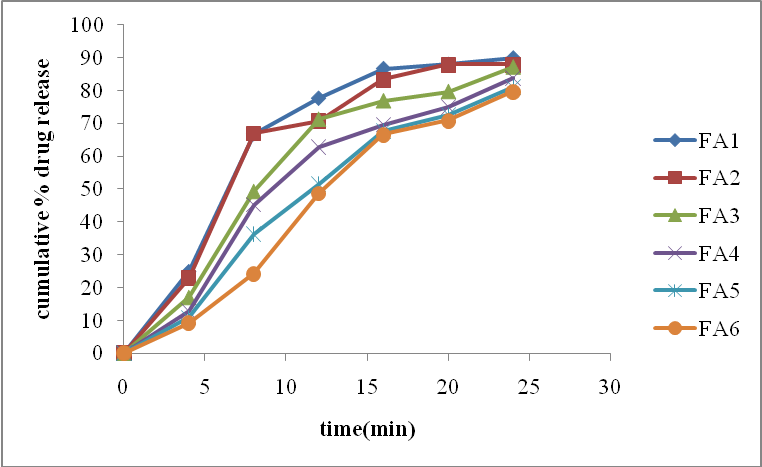 Fig. 1: In vitro drug release of FA1, FA2, FA3, FA4, FA5 and FA6 tablet formulations