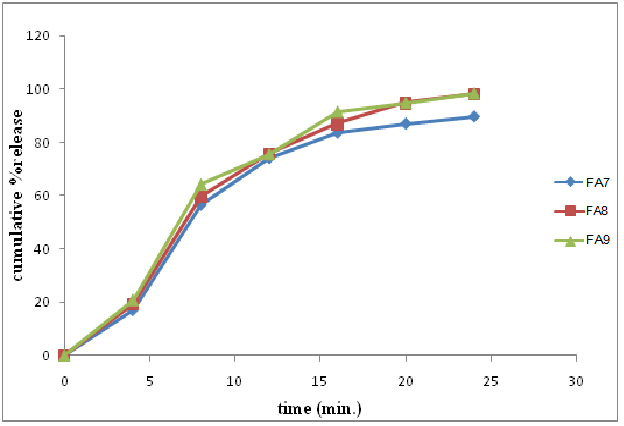 Fig. 2: In vitro drug release of FA7, FA8, and FA9 tablet formulations