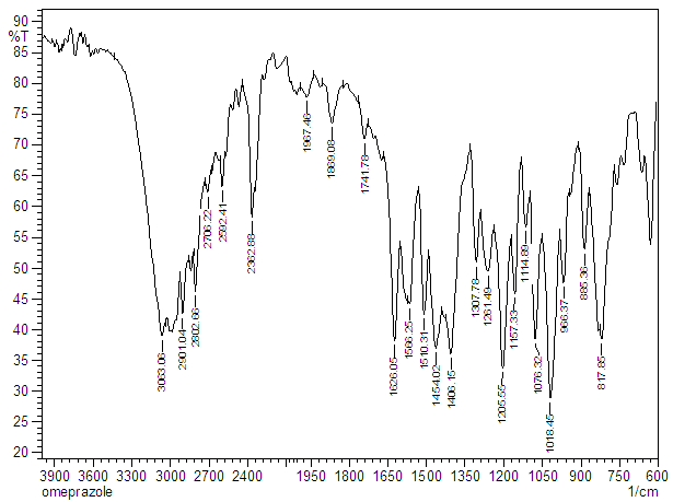 The infrared spectrum was taken for the pure omeprazole. FT-IR studies were carried by KBr disk method using computer mediated Fourier transformed infrared spectroscopy (FTIR) (Shimadzu Model–IRAFFINITY-1, Serial No. A21374600405).