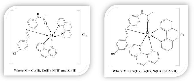 Schiff bases have been imperative to as promising antibacterial agents. For example, Mahalakshmi et al. [21] and Raman et al. [22] synthesized a few new Schiff base ligands (obtained by the condensation of N-(4-aminophenyl)acetamide and 4-chloro-benzaldehyde/4-hydroxybenzaldehyde) as main ligand with 1,10-phenanthroline as co-ligand and their Cu(II), Co(II), Ni(II) and Zn(II) complexes (fig. 1) of the composition [M(L)(phen)2]Cl2, these complexes were tested against bacteria. The agar diffusion method was used to evaluate the antibacterial activity of the synthesized metal complexes. The in vitro antimicrobial screening effects of the synthesized compounds were tested against five bacterial strains namely, Staphylococcus aureus, Pseudomonas aeruginosa, Escherichia coli, Staphylococcus epidermidis and Klebsiella pneumoniae. It is found that all the metal complexes have greater inhibitory effects than the free ligand. The DMSO control showed no activity against any bacterial strain.