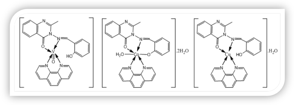 Shiva Prasad et al. [28] showed the results of the activity of transition metal complexes with 3-(2-hydroxybenzylideneamino)-2-methylquinazolin-4(3H)-one and 1,10-phenanthroline (fig. 3). The in vitro antimicrobial screening effects of the synthesized compounds were tested against five bacterial strains namely, Bacillus subtilis, Escherichia coli, Staphylococcus aureus, Ralstonia solanacearum and Xanthomonas vesicatoria by disk diffusion method, using nutrient agar medium. The results were compared with that of chloramphenicol (MIC= 4 µg ml-1) [23], a standard antibiotic for bacterial strains. The metal complexes showed antimicrobial activities against all the tested bacterial strains with the MIC values in the range of 8-32 µg/ml. The cobalt(II) and oxovanadium(IV) complexes were found to be most active against the tested bacterial strains at 8-16 µg ml-1, whereas copper(II) complex inhibited the bacterial growth at a concentration of 32 µg ml-1.