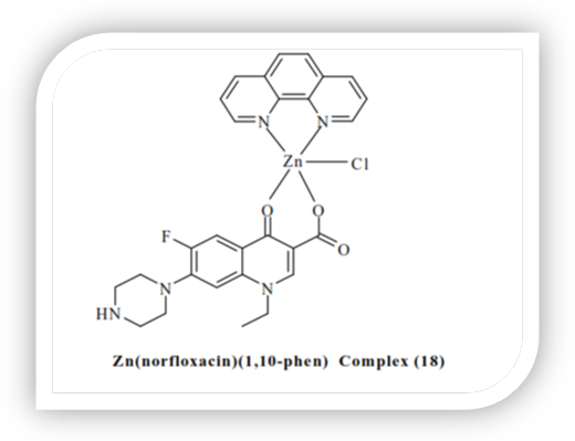 Prafulla et al. [30] studied a few mixed fluoroquinolone and N-donor ligands and their complexes. Among the complexes studied, the zinc complexes (fig. 4) were found most active ones against E. coli compared to S. aureus. Especially, the zinc-norfloxacin-N-donor complex was the most active one against E. coli and S. aureus when compared to other corresponding zinc–quinolone complexes.