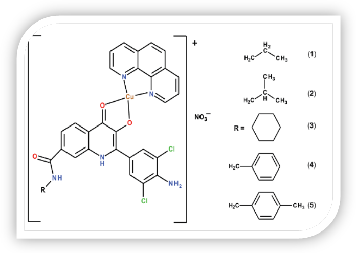A series of five copper(II) mixed-ligand complexes [44] with the composition [Cu(quix)(phen)]NO3. yH2O(1 to 5),where Hquixstands for 2-(4-amino-3,5-dichlorophenyl)-3-hydroxy-4(1H)-quinolinone-7-carboxamides with different N-substitutions: Hqui1=N-propyl (1), Hqui2= N-isobutyl (2), Hqui3 = N-cyclohexyl (3), Hqui4 = N-benzyl (4), and Hqui5 = N-p-xylyl (5); phen = 1,10-phenanthroline and y = 0 or 1, (Scheme 1) were synthesized, characterized and screened for in vitro antitumor activity on a panel of six human cancer cell lines, including osteosarcoma (HOS), breast adenocarcinoma (MCF7), malignant melanoma (G361), cervix carcinoma (HeLa), ovarian carcinoma (A2780) and cisplatin-resistant ovarian carcinoma (A2780R). All the complexes, except for limitedly soluble complex 4, showed very potent cytotoxicity (IC501–7 mM). The best IC50 value was found for complex 5 against A2780, with IC50 = 0.6(1) mM.