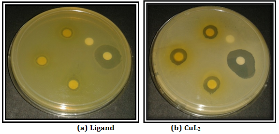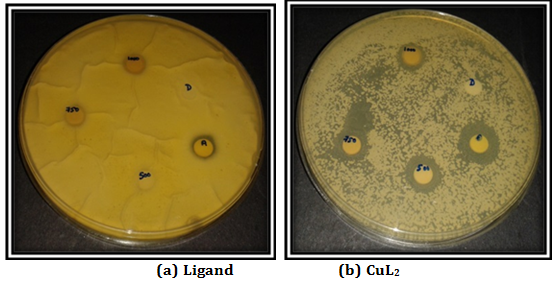 Minimum Inhibitory Concentration (MIC) was defined as the lowest concentration of an antimicrobial that will inhibit the visible growth of a microorganism after overnight inhibition. Clinically MIC are used not only to determine the amount of antibiotic that the patient will receive also abut the type of antibiotic used, which in turn lowers the opportunity for microbial resistant to a specific antimicrobial agent. Applying MIC testing to a number of bacterial strains in the same species provides an estimate of the concentration that inhibits 50% and 90% of bacterial isolates and can indicate shifts in susceptibility of bacterial populations to antibiotic [17]. MIC of compounds was determined in nutrient agar plate by microdilution method according to the National Committee for clinical laboratory standards. Standardized suspension of test organisms (0.1 ml, 106cfu/ml) were placed in Petri plates. The Schiff base ligand its metal complexes were taken in petri plates. Ampicillin and Amphotericin B were used as positive control for bacterial and fungal strains and DMSO was used as a negative control for both the strains. The bacterial plates were incubated at 37 °C for 18 h and fungal plates were incubated at 32 °C for 48 h. The diameter Zone of inhibition inhibits the bacterial and fungal growth compared with the control was recorded as MIC.
