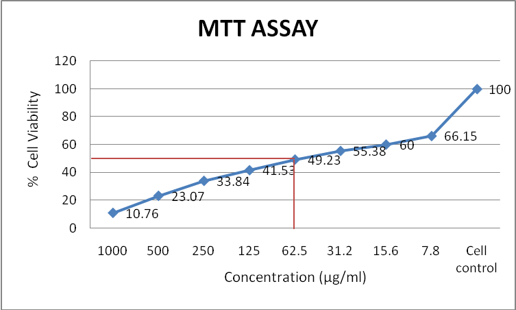 Cells (1 × 105/well) were plated in 24-well plates and incubated in 37 °C with 5% CO2 condition. After the cell reaches the confluence, the various concentrations of the samples were added and incubated for 24 hours. After incubation, the sample was removed from the well and washed with phosphate-buffered saline (pH 7.4) or MEM without serum. 100 µl/well (5 mg/ml) of 0.5% 3-(4,5-dimethyl-2-thiazolyl)-2,5-diphenyl--tetrazolium bromide (MTT) was added and incubated for 4 hours. After incubation, 1 ml of DMSO was added in all the wells. The absorbance at 570 nm was measured with UV-Spectrophotometer using DMSO as the blank. Measurements were performed and the concentration required for a 50% inhibition (IC50) was determined graphically. The % cell viability was calculated using the following formula: