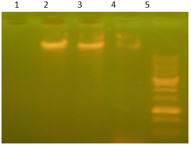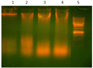 Fig. 4: DNA Fragmentation of [HgL2]Cl2 and [CuL2]Cl2, Lane 1: Control, Lane 2: Concentration-125 µg/ml, Lane 3: Concentration-62.5 µg/ml, Lane 4: Concentration-31.2 µg/ml, Lane 5: Marker (100bp DNA Ladder)