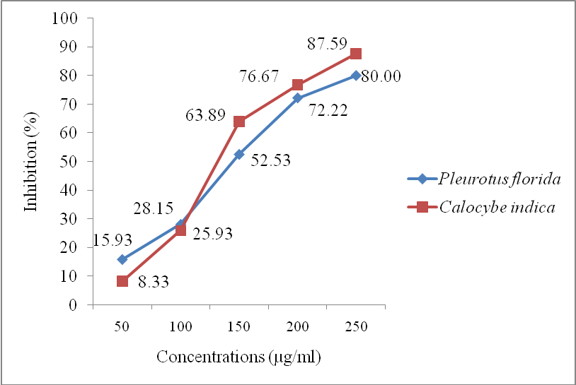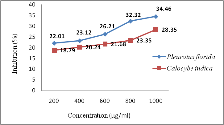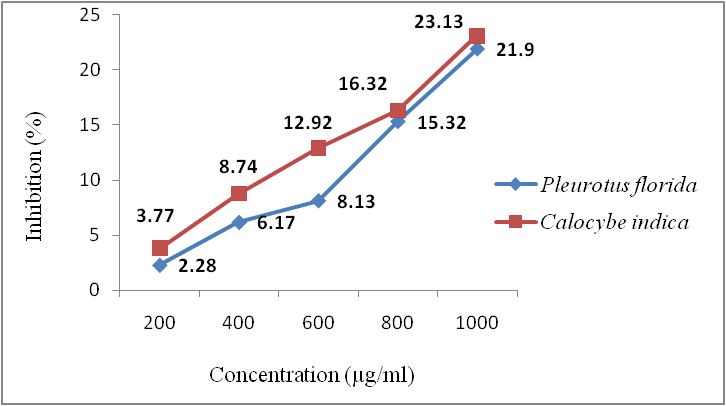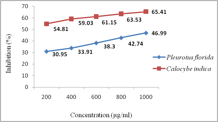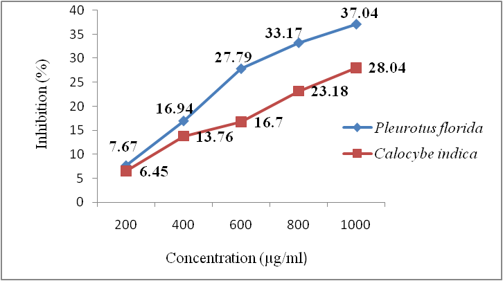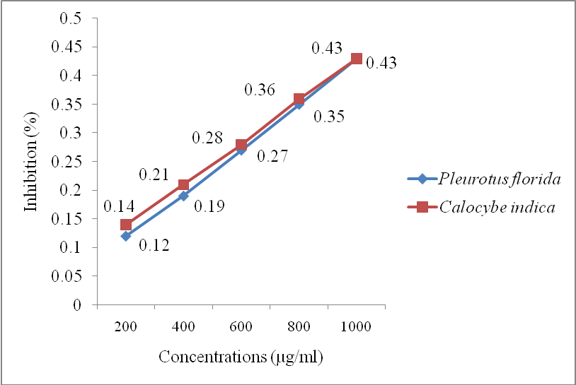 Fig. 6 summarizes that the reducing power of the extracts of Pleurotus florida and Calocybe indica was found to be excellent which steadily increased in direct proportion to the increasing concentrations of the extract. The reducing power inhibition percentages were found to be 0.43±0.007 % in P. florida and 0.43±0.005 % in C. indica.
