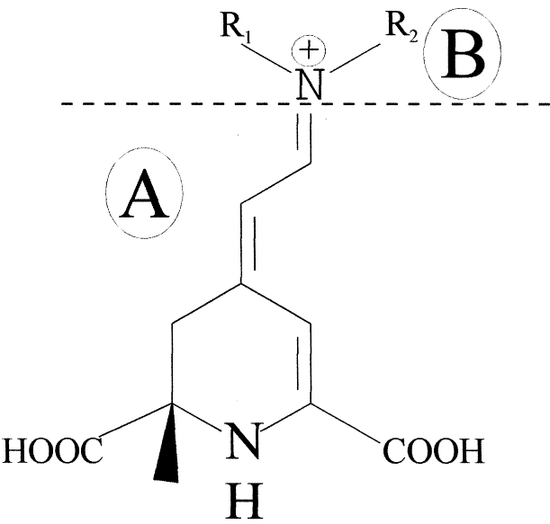 Betalain general formula (A) Betalamic acidmoiety (B) The structure will be betacyanin or betaxanthin depending on the residue R1 and R2