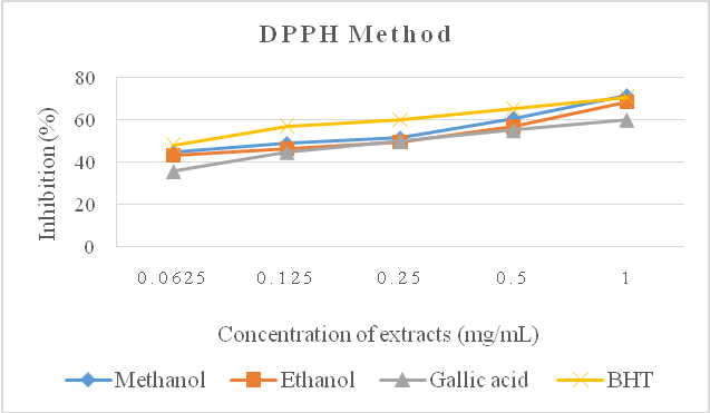 The antioxidant activity of the extracts was measured by using stable radical DPPH˙ as a reagent and the activity was determined in terms of hydrogen donating and electron releasing abilities of the extracts. The different working solutions of the extracts were prepared in methanol (1, 0.5, 0.25, 0.125, 0.0625 mg/ml). The DPPH solution (0.002%) was also prepared in methanol. In each of the test-tubes different concentration of the extract was taken and the made up the volume to 2 ml, to this was added 2 ml of DPPH solution and test-tubes were then incubated for 30 min at room temperature. The same procedure was followed for BHT and Gallic acid as well. Methanol with DPPH was used as control. The method given above is the same as used by Kahalaf [29]. With slight modification. The absorbance was recorded at 517 nm using UV-Visible spectrophotometer. The radical scavenging activity of each extract was calculated by using the following equation: