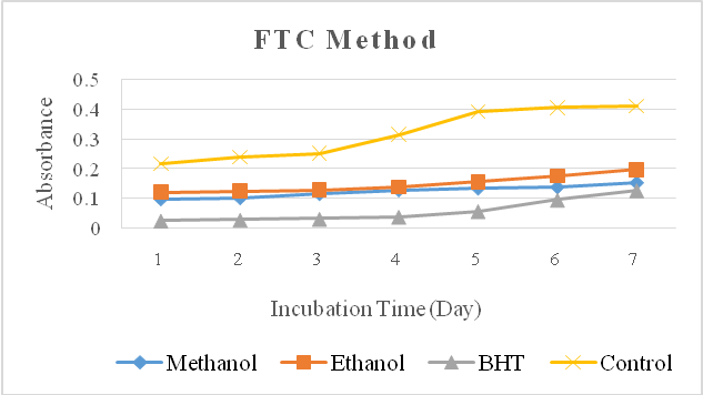 The FTC Method was used to determine the antioxidant activity of extracts [30]. 4 mg of each extract was dissolved in 4 ml of ethanol (99.5%), to it was mixed 4.1 ml of linoleic acid (2.5% in ethanol 99.5%), 8 ml of Phosphate Buffer (0.02M, pH 7) and 3.9 ml of distilled water. The mixture was then incubated at 40oC in an oven. After this, 9.7 ml of ethanol (75%) and NH4SCN (30%) was added to 0.1 ml of the reaction mixture to measure the extent of the antioxidant activity. After 3 minute of the addition of 0.1 ml of ferrous chloride (0.02M) in 3.5% HCl to the reaction mixture, the absorbance was measured at 500 nm using UV-Visible Spectrophotometer. The absorbance was taken at every 24 h until the maximum value of control absorbance was obtained. BHT was used as standard here. The inhibition of lipid per-oxidation was measured as follows-