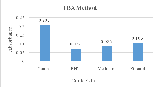 TBA method is used to measure extent of lipid per-oxidation at secondary stage where peroxide decomposes to form carbonyl compounds. Both the extracts showed strong antioxidant activities. The percentage of antioxidant activities of methanolic extract and ethanolic extract and BHT were 58%, 49% and 65% respectively. The absorbance of control sample obviously showed the highest reading. This result is similar to that reported by Huda-faujan [30] and Aris [33] that the control sample had the highest absorbance reading in TBA after seven days of storage. fig: 4 shows that the amount of peroxide in the initial stage of lipid per-oxidation is greater than the amount of peroxide present in the secondary stage.