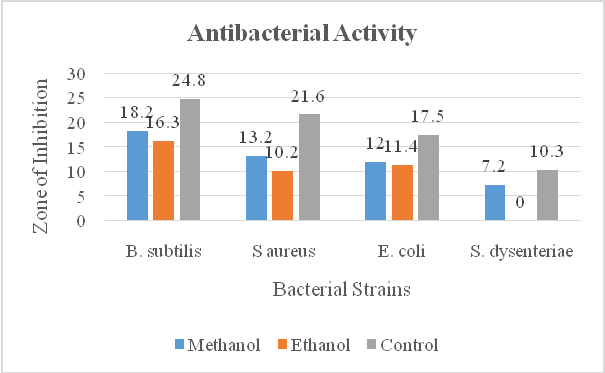 Along with these activity in vitro antibacterial activity of ethanolic and methanolic extracts of Beet root was examined by using agar well diffusion method. According to the result given in fig. 5, methanolic extract exhibits strong activity against both gram positive and gram negative strains and showed highest activity against B subtilis with 18.2 mm ZI. On the other hand ethanolic extract showed weak antibacterial activity that was comparable with the standard. Methanolic and ethanolic extracts exhibited antibacterial activity in descending order B. subtilis>S. aureus>E. coli>S. dysenteriae. This result have similar observation with that of TPC as the methanolic extract possessed higher phenolic content than ethanolic extract. Thus Beet root extracts could be used as an effective antibacterial agent.