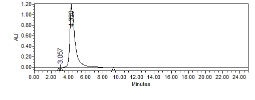Curcuminoid is an important component of turmeric. Among curcuminoids, curcumin is an important constituent. Extensive research in past half century has indicated the importance of curcumin in pharmacology. The HPLC chromatogram of turmeric flower at the wavelength of 425 nm observed two peaks at the retention time (RT) of 3.057 and 4.320. The peak at the retention time of 4.320±0.056 was identified as curcumin. The purity of the compounds was checked through the standard of curcumin (RT 4.391) (fig. 1a and fig. 1b)