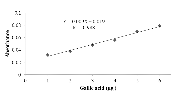 Total phenolic contents of ethanolic extract of the flower were determined using the Folin-Ciocalteu reagent according to the method of [8]. A solution was made by mixing the 1000 µg sample mixed with 46 ml sterilized distilled water and 1 ml Fiolin-Ciocalteu reagent. The mixture was mixed by a shaker for 3 min to react.3 ml aqueous solution of 2% Na2CO3 was then added to it was then added to it and left for 2 h incubation period at room temperature. The absorbance of each mixture was measured at 760 nm in the spectrophotometer. The same procedure was also applied to the standard solution of gallic acid, and an equation was obtained by the standard curve. Total phenolic contents of the turmeric flower were obtained by putting the absorbance value of the sample at 760 nm to standard curve and equation expressed as µg gallic acid equivalent/mg of the sample.