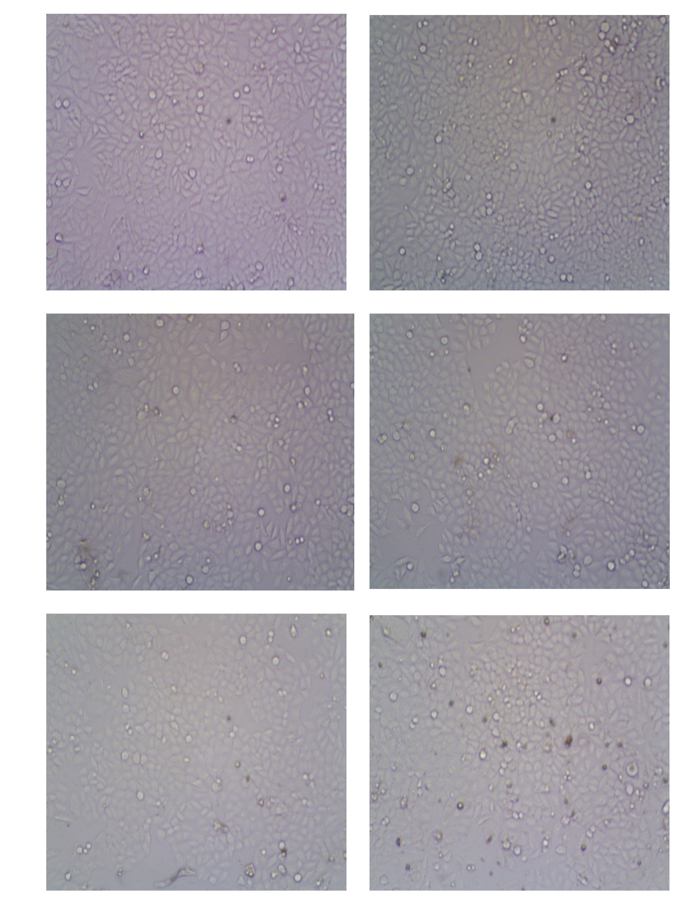 Fig. 2: Cytotoxic activity of chitosan nanoparticles added with 5 Fluro uracil against Hep G2, the Liver cancer cell line. a: Control; b-f: Hep G2 Liver cancer cell line treated with (3.125, 6.25, 12.5,25 and 50μg) different concentrations of chitosan nanoparticle