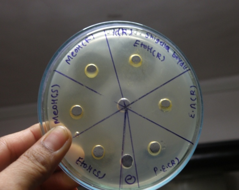Zone of inhibition<9 mm zone was considered as inactive; 9-12 mm as partially active; while 13-18 mm as active and>18 mm as very active [21]. According to this, most potent extracts of all plant materials were found to be either active or very active. Among the different solvent extracts studied, for ripened Anthocephalus cadamba fruits, macerated ethanol extract was found to be most potent extract against all the pathogens whereas for unripened fruits macerated methanol extract was found to be most potent. In the case of Scirpus kysoor Roxb. tuber macerated ethyl acetate and pet ether extracts were found to be most potent against all the pathogens. The maximum zone of inhibition was observed against S. boydii by macerated ethanol extract of ripened Anthocephalus cadamba fruit which was 24 mm. (shown in fig. 1). For S. Aureus highest antimicrobial activity exhibited by macerated pet ether extract of Scirpus kysoor Roxb. tuber (19 mm) followed by macerated ethanol extract (18 mm) of ripened Anthocephalus cadamba. For B. cereus macerated Pet ether and ethyl acetate extract of Scirpus kysoor Roxb. tuber (19 mm) followed by macerated ethanol extract (18 mm) of ripened Anthocephalus cadamba showed the highest activity. For E. coli, S. abony and S. boydii macerated ethanol extract of ripened Anthocephalus cadamba showed the highest activity (19, 17, 24 mm resp).