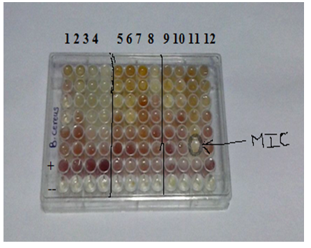 Fig. 2: MIC of plant materials against bacillus cereus, 1-4, 5-8, 9-12:-methanol,ethanol,ethyl acetate and pet ether extracts of unripened Anthocephalus cadamba, ripened Anthocephalus cadamba and Scirpus kysoor Roxb. Respectively