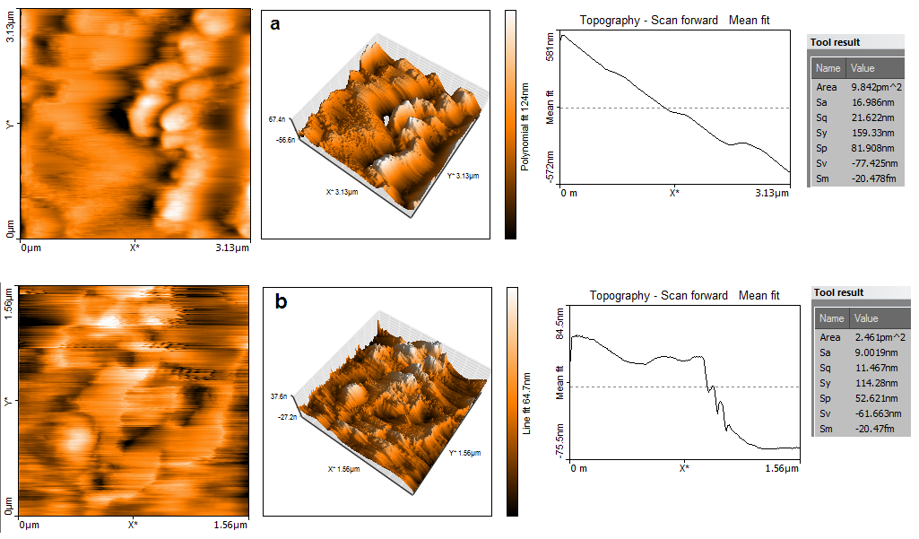 The structural characterization of polyaniline nanofiber modified GCE and the modified surface adsorbed with ibuprofen was performed by atomic force microscopy (AFM). Nano Surf Easyscan 2AFM microscope operated in tapping mode under ambient conditions was employed. TopAl208 probes with a spring constant of 20–80 N/m were used.