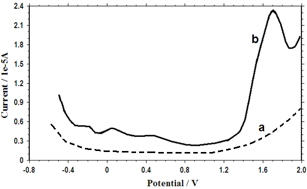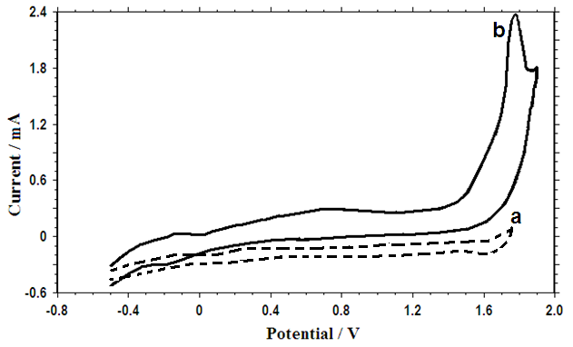 The cyclic voltammogram of 200 ppm ibuprofen in pH 1.0 on polymer film modified electrode exhibits a single well defined anodic peak in the potential range–0.5 to 1.8V. This anodic peak is assigned to the oxidation of ibuprofen at 1.63 V which is not accompanied by corresponding cathodic reduction. This behavior suggested that the irreversibility of the electrode process. Fig. 2 exhibits the cyclic voltammogram of polymer modified electrode (curve a), 200 ppm ibuprofen on polymer film modified (curve b) in pH 1.0. The polymer film modified surface shows a well defined and a sharp anodic peak is obtained