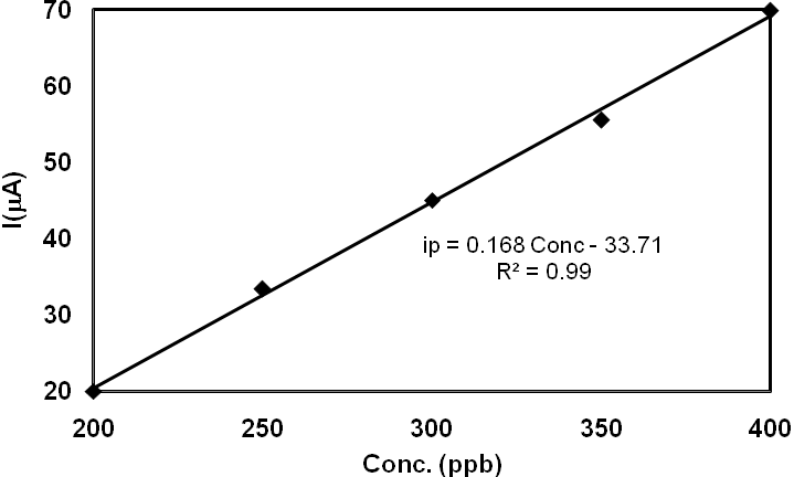 Under optimum experimental conditions, the influence of concentration on the stripping signal was studied. The experimental results showed that the peak current increased with the increase in the concentration of ibuprofen. A representative differential stripping voltammogram is given in fig. 4. A calibration was made, which indicated the linear dependence of peak current with concentration fig. 5. The range of determination was found in between 200 ppb and 400 ppb. The lower limit of detection was 100 ppb. The reproducibility of the stripping signal was understood from relative standard deviation (2.1%) calculated for 7 identical measurements at a concentration level of 250 ppb.