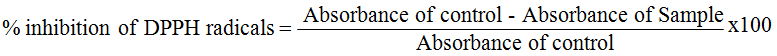 For assessment of DPPH radical scavenging activity, DPPH solution was prepared by dissolving 4 mg DPPH in 100 ml methanol. A dilution series were prepared for ascorbic acid and extract. After that 5 ml of sample solution was mixed with 0.5 ml DPPH solution and incubated for 30 min at room temperature in dark condition and absorbance was taken at 517 nm and calculated the % inhibition of DPPH radical [11].