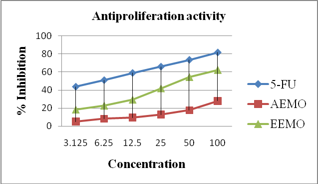 Fig. 1: It shows that the percentage inhibition or cytotoxicity in HT-29 human colon cancer cell lines of Moringa oliefera ethanolic and aqueous extracts (3.125 to 100 μg/ml) compared to 5-Fluro uracil as a standard drug. Values are expressed as inhibition Vs Concentration