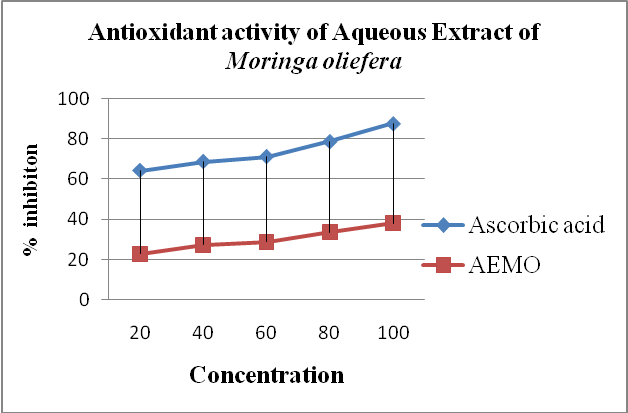 Fig. 2: It shows that the percentage inhibition in DPPH radical scavenging activity of Moringa oliefera aqueous extracts (20 to 100 μg/ml) compared to standard drug ascorbic acid. Values are expressed as inhibition Vs concentration