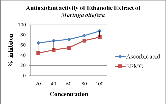 Fig. 3: It shows that the percentage in DPPH radical scavenging activity of Moringa oliefera ethanolic extracts (20 to 100 μg/ml) compared to standard drug ascorbic acid. Values are expressed as inhibition Vs Concentration