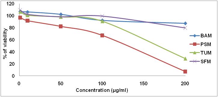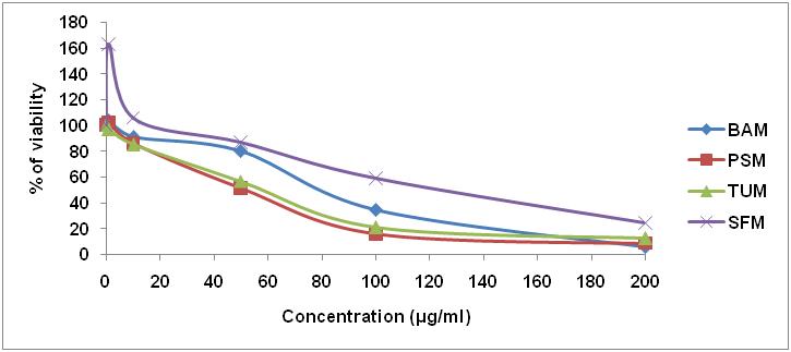 The selected plant extracts showed the dose-dependent cytotoxicity activity on the tested cell lines (fig. 1, 2). The cytotoxicity variations on different cell lines were observed for selected plants extracts. The IC50 values are showed in table 1. The cytotoxicity of the extracts was increased as the concentration of them was increased. The selected plants B. axillaris, T. ulignosa, P. semierectus and S. fruticosa have been using by people around the southern parts of the India for treating the diseases [7, 8].