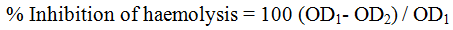 Anti-inflammatory activities of the synthesized analogs were carried out by using Human Red Blood Cell (HRBC) membrane stabilization method at doses of 100 μgm, 250 μgm, and 500 μgm. To the control test tube added 1 ml solvent, 2 ml phosphate buffer, 1 ml hyposaline and 0.5 ml of HRBC suspension. To the test tube add 1 ml of the test compound, 2 ml of phosphate buffer, 1 ml of hyposaline and 0.5 ml of HRBC suspension. The assay mixture was incubated at 37 °C for 30 min and centrifuged at 3000rpm. The hemoglobin content in the supernatant solution was estimated by measuring the absorbance at 500 nm. Diclofenac sodium (100μgm/ml) was used as the standard drug. The control group was given Dimethyl sulphoxide (DMSO). Percentage inhibition of hemolysis can be calculated by the following formula,