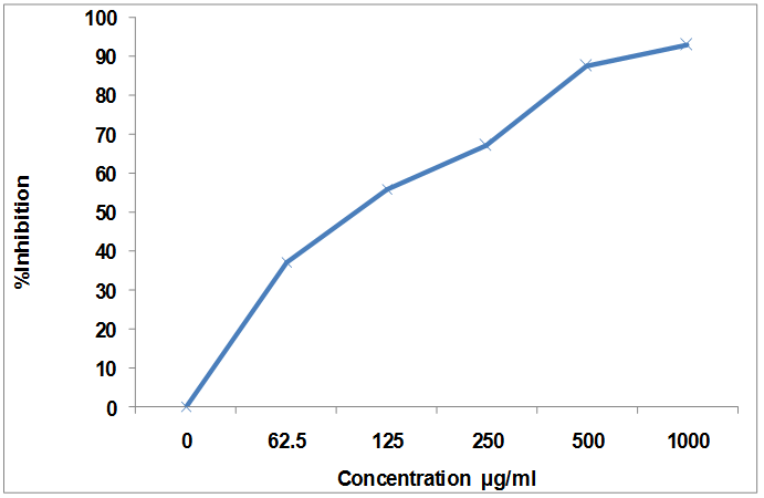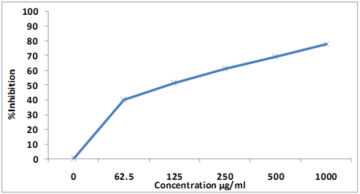 In performing cytotoxic activity, There was gradual increase in the value of PGI (percentage of growth inhibition) as the concentration of extract was increased (39.68, 51.06, 60.92, 68.95, 78.00 % for the concentrations 62.5, 125, 250, 500, 1000µg/ml, respectively) against the HepG2 cell line (fig. 1) and (37.01, 55.76, 66.93, 87.31, 92.81 % for the concentrations 62.5, 125, 250, 500, 1000 µg/ml, respectively) against HeLa cell line (fig. 2). The median value of IC50 observed for HepG2 and HeLa cell lines were 110.00±1.9 and 104.50±0.9 respectively.