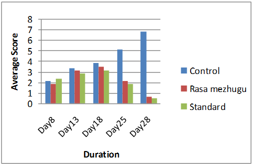 On 28th day, all group animals were observed thoroughly for the above changes the score was calculated as per the above table. Normal-0, Control-1+1+1+1+3=7, Rasa mezhugu-0+0+0+0+1=1, Standard-0. An arthritic index is calculated as the sum of the scores as indicated above for each animal. The average of the treated animals was compared with the control group.